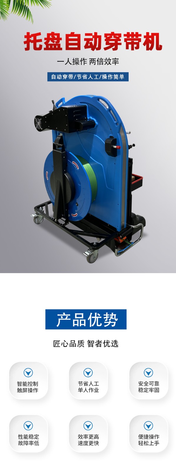- 在包裝流程中主要起輔助作用。它是為打包機的工作做鋪墊,將打包帶準確地放置在合適的位置,方便打包機進行后續操作。如果把包裝過程比作一場接力賽,穿帶機就像是第一棒,為后續打包機的工作創造良好的條件。