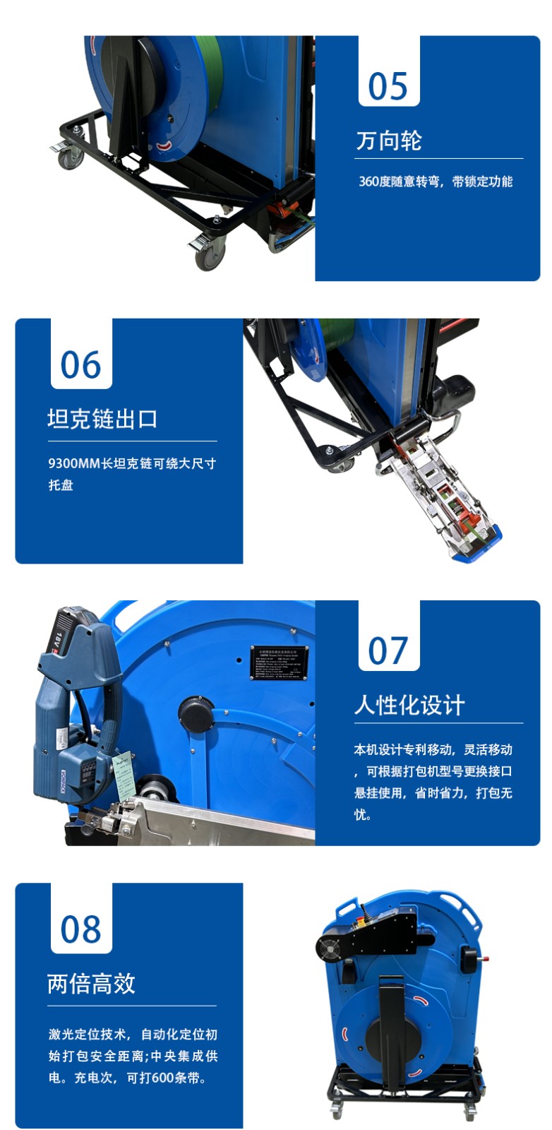 - 導向系統是穿帶機的重要組成部分。由多個可調節的導向輪和導軌構成,用于引導打包帶按照預設的路徑穿過貨物,確保打包帶的位置準確。