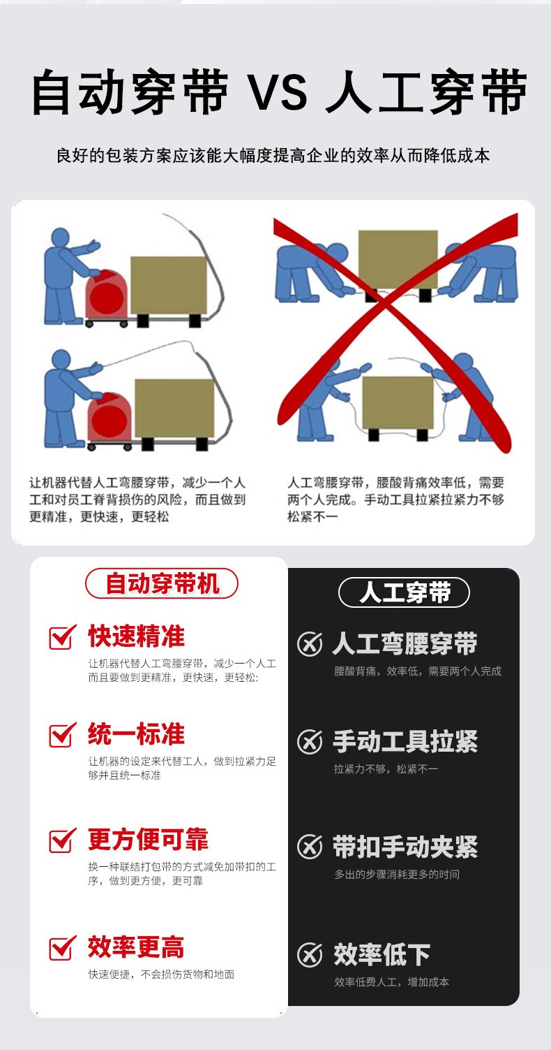 相比人工捆扎(單道耗時 30-60 秒),自動托盤穿帶打包機的核心優(yōu)勢體現(xiàn)在三個維度: