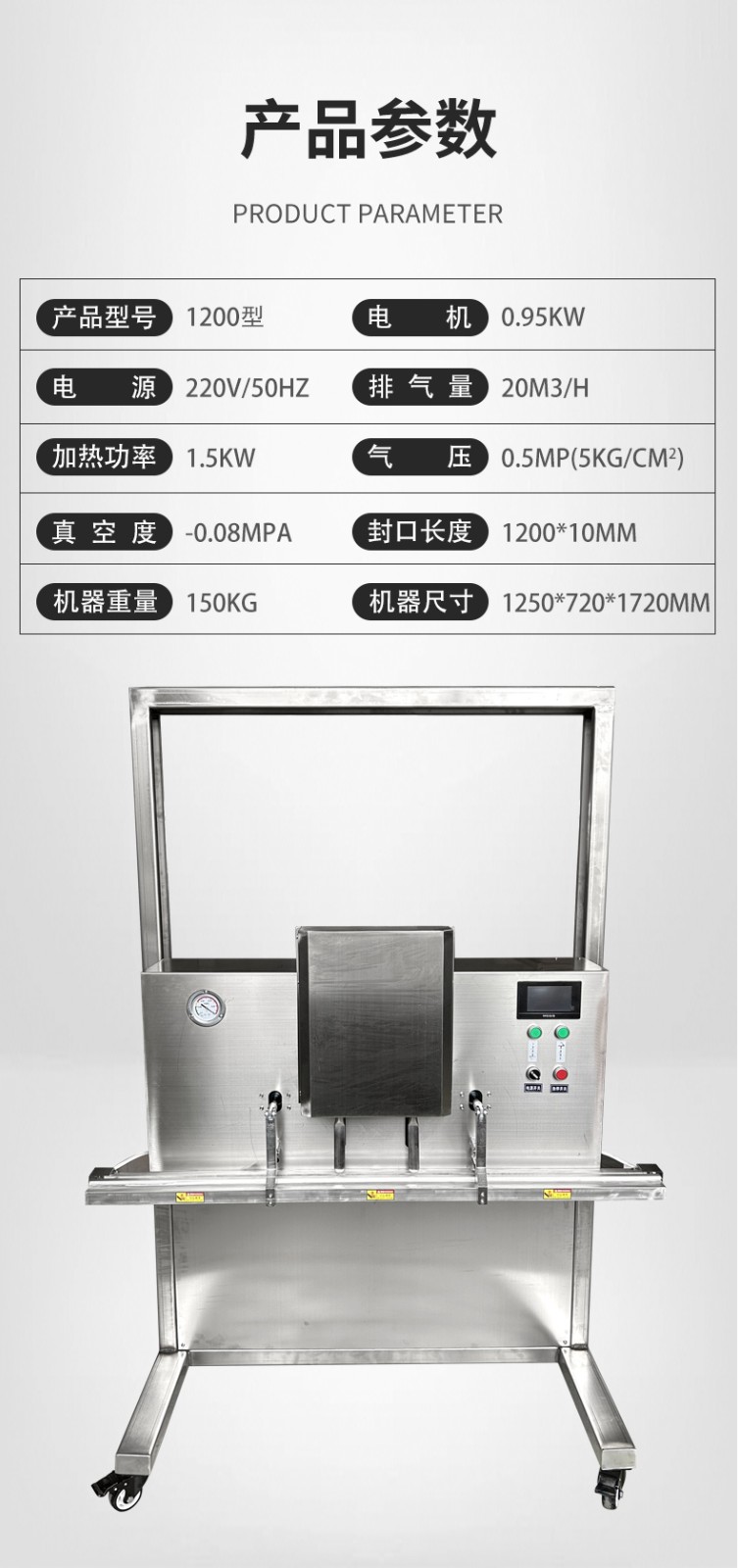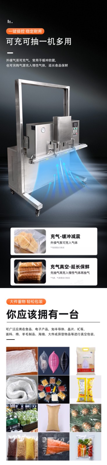 可定制與多模式適配不同尺寸:部分機型支持封口規格定制,封口長度可達到 800mm、1000mm 甚至 1200mm 等,適配不同寬度的包裝袋。同時,部分先進機型預設多組工作模式,可快速切換真空、充氣、封口等流程,適配從小袋糕點到大袋五金模具等不同尺寸、類型產品的包裝需求。