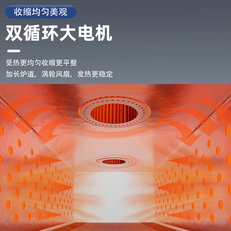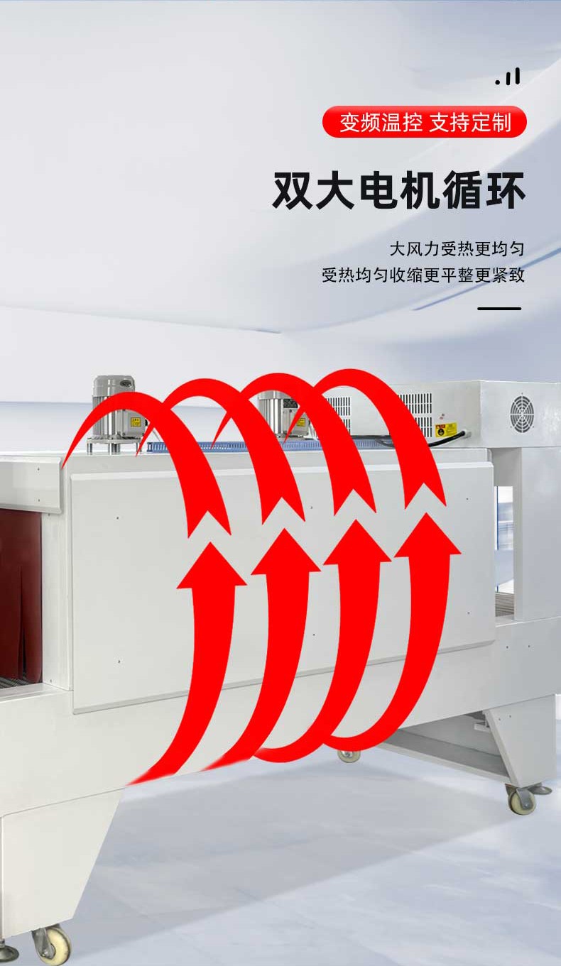 熱收縮定型:封切后的產(chǎn)品進入熱收縮區(qū),通過高溫?zé)犸L(fēng)循環(huán)系統(tǒng)使膜材均勻收縮,緊密貼合產(chǎn)品輪廓。