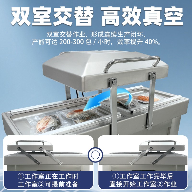 • 高效包裝:兩個真空室可交替工作,當一個真空室進行抽真空和封口操作時,另一個真空室可進行下一批產品的擺放等準備工作,大大提高了包裝效率,減少了整體運作時間3