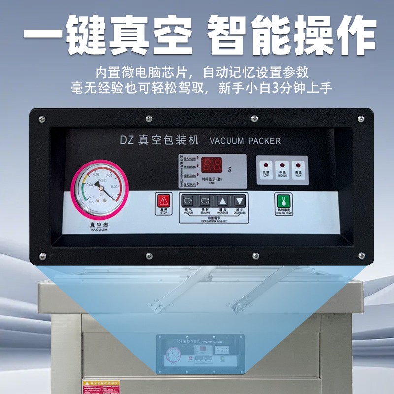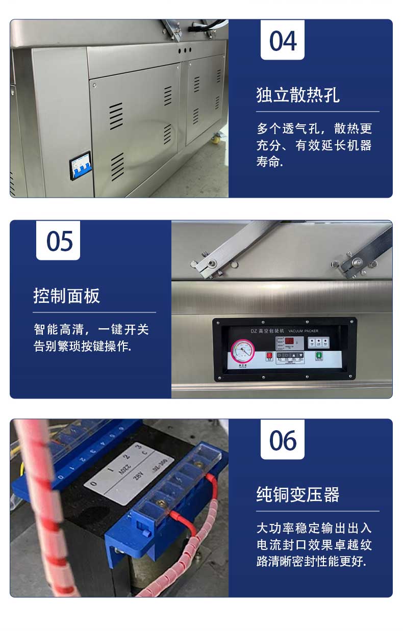 6. 回氣與開蓋:當達到設定熱封時間時,熱封指示燈熄滅,真空室經電磁閥進入大氣,直至機蓋自動抬啟,取出包裝好的產品,完成一次包裝循環。