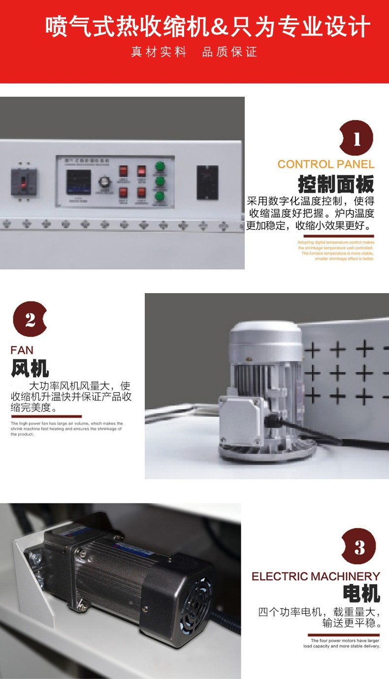 - 加熱系統(tǒng):這是噴氣式熱收縮機(jī)的核心部分之一。它通常由加熱管、溫度控制器等組成。加熱管一般采用石英加熱管或不銹鋼加熱管,能夠快速產(chǎn)生大量的熱能。溫度控制器可以精確地調(diào)節(jié)和控制加熱溫度,以適應(yīng)不同類型的熱收縮薄膜和產(chǎn)品的要求。例如,對(duì)于不同厚度的薄膜,需要設(shè)置不同的加熱溫度,一般溫度范圍在 100 - 300℃之間。