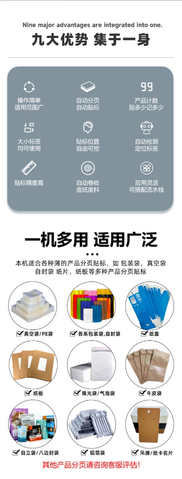 - 靈活性與適應性:全自動分頁貼標機可以根據不同的產品和標簽需求進行快速調整和設置,能夠適應多種產品規格和標簽樣式的貼標任務。無論是產品尺寸的變化還是標簽內容、形狀的改變,設備都可以通過簡單的參數設置或更換少量部件來滿足新的生產要求,在大規模生產中具有很強的靈活性和適應性。