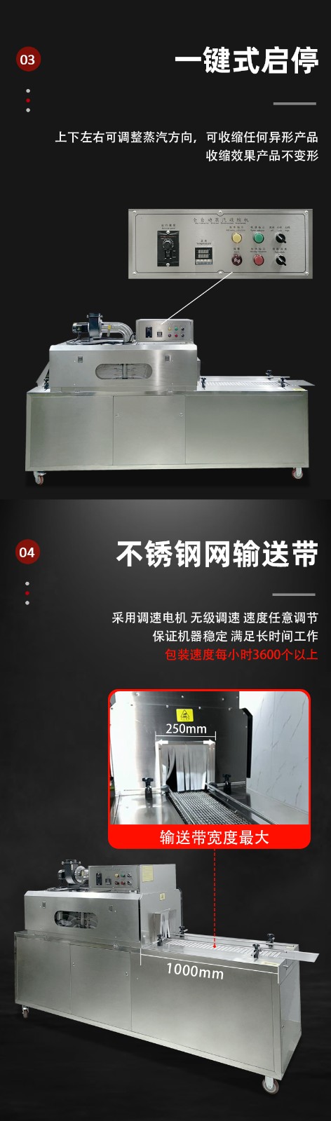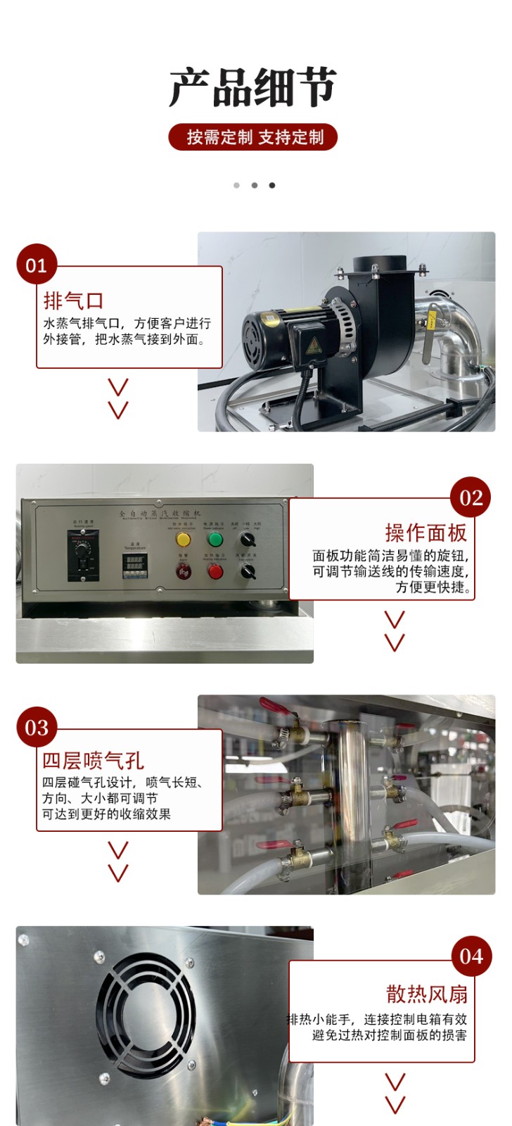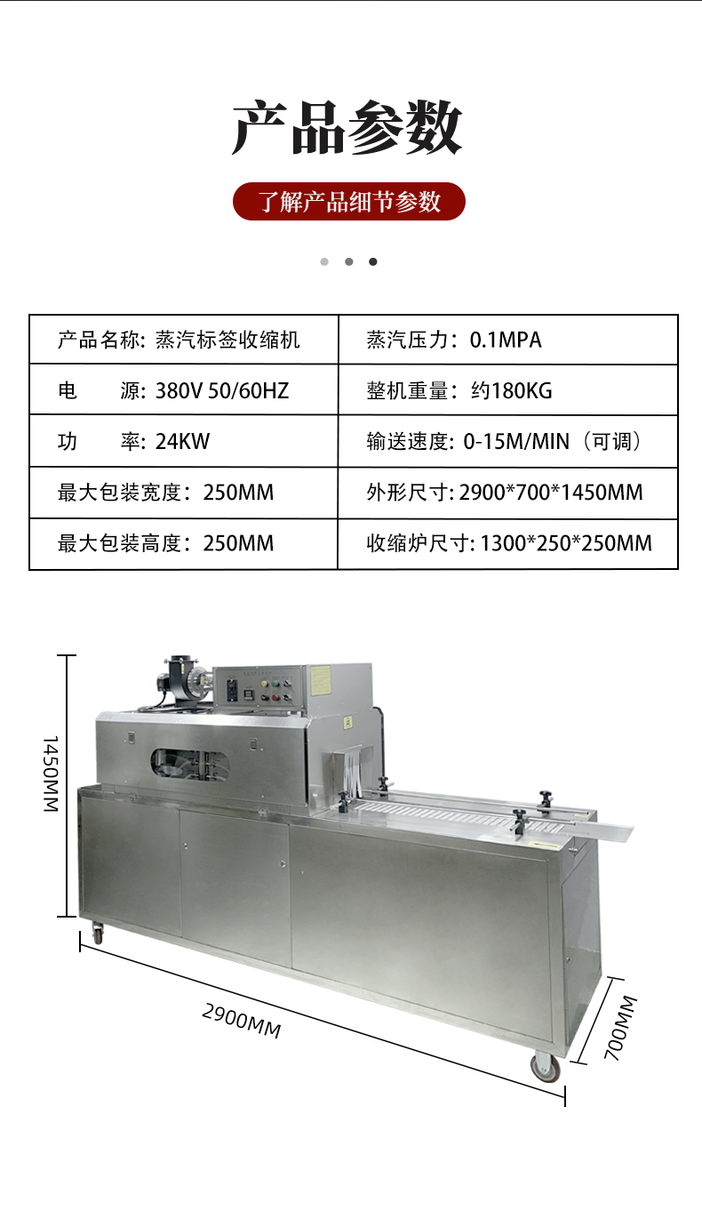 設(shè)備的結(jié)構(gòu)設(shè)計(jì)圍繞 “蒸汽產(chǎn)生 - 加熱收縮 - 產(chǎn)品輸送 - 參數(shù)控制” 展開(kāi),核心部件包括四大模塊: