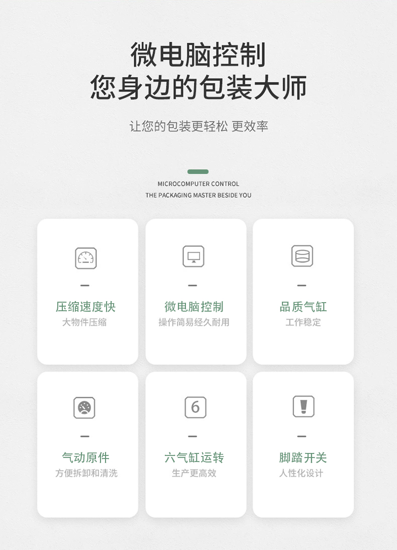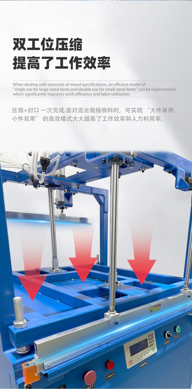 雙工位壓縮封口機:兩個工位可同時作業(yè),一邊封口時另一個可放件 / 取件,適合中小批量、多規(guī)格產(chǎn)品(如多口味食品、電子元件袋),效率比單工位高 50%-80%。