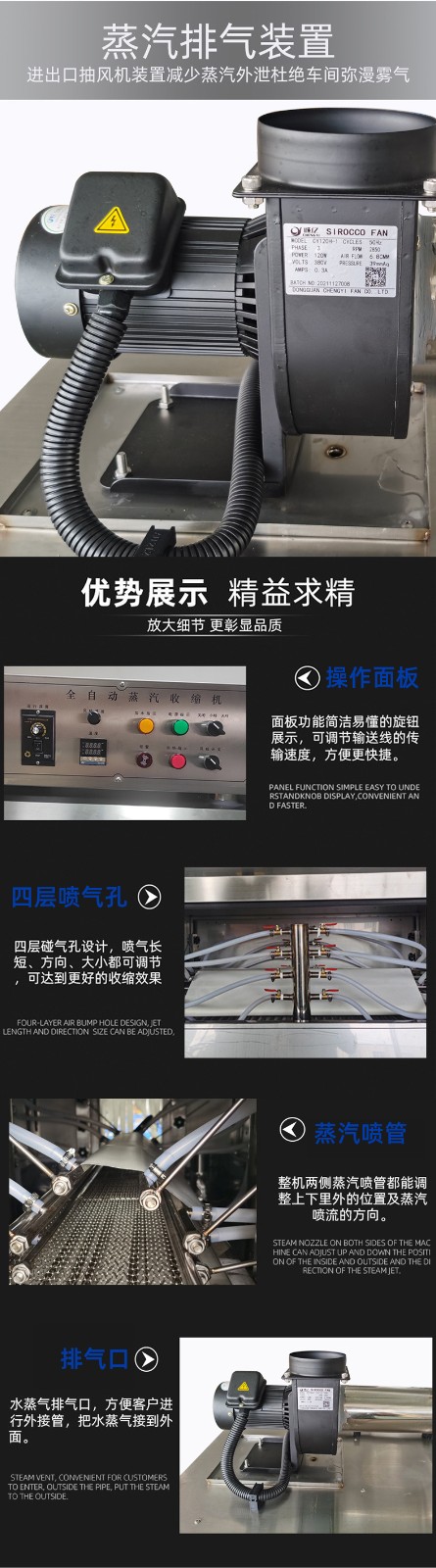 - 收縮效果均勻美觀收縮室采用環形蒸汽噴射設計,蒸汽能 360° 無死角包裹產品表面,使熱收縮膜受熱均勻,收縮后緊密貼合產品輪廓,無褶皺、無氣泡,即使是異形、棱角分明的產品(如五金工具、瓶裝飲料),也能實現平整光滑的包裝效果。